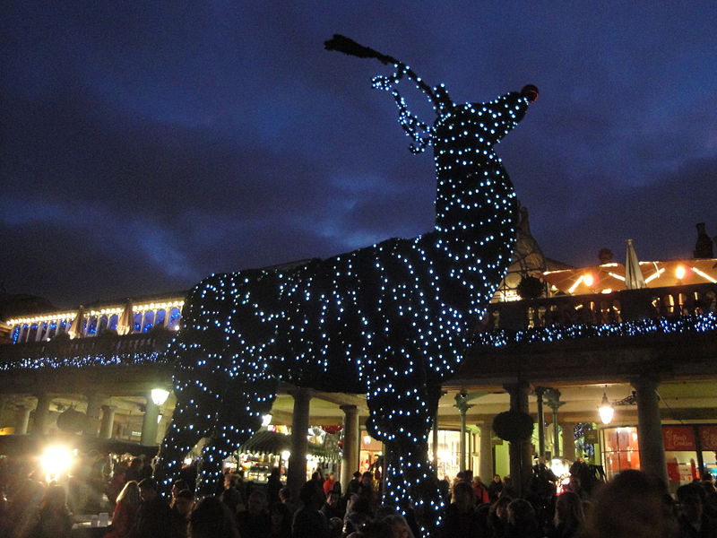 Spending a delightful day in mid-November in London, England, it was obvious that the city was preparing for Christmas. The stores, the streets, the advertisements all reminded one that “Christmas is coming.” Particularly enjoyable was a stroll through Covent Garden Market, where the decorations were all in full display. The gigantic Christmas tree was adorned in only lights and balls of all sizes. Overhead were gigantic red balls dangling from the rooftop of the market square. A hugh reindeer made of greenery was adorned with white lights.